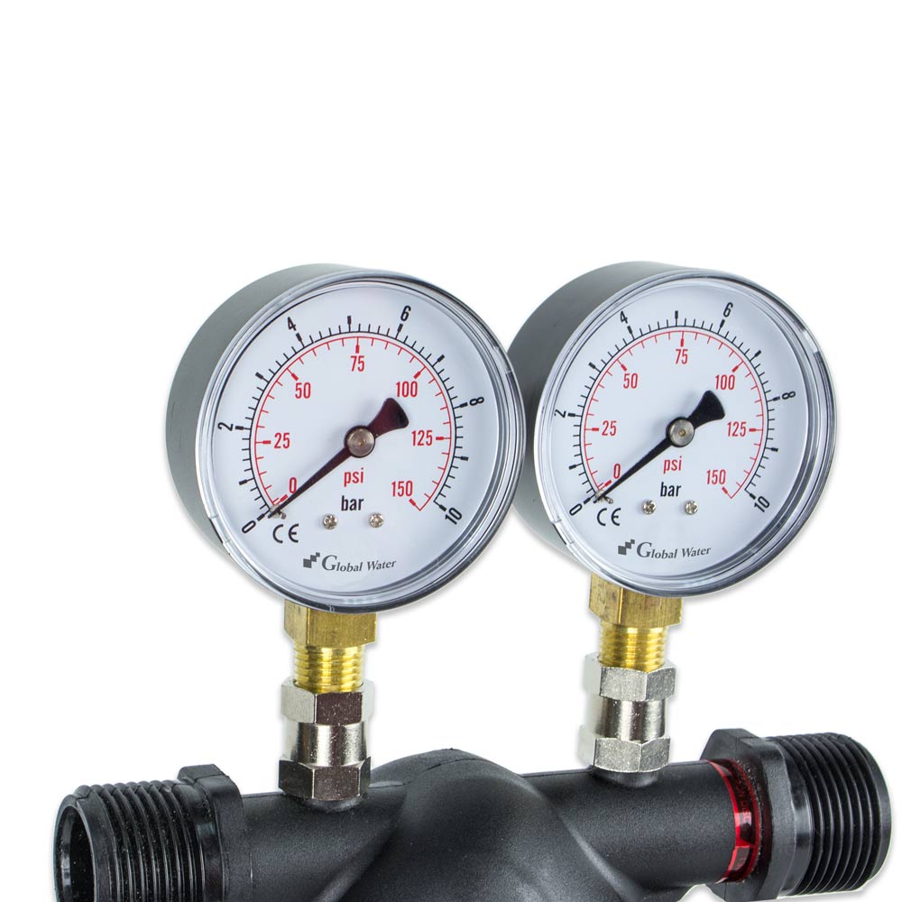 Комплектът включва два манометъра, показващи стойността на водното налягане преди и след филтъра. Работен диапазон на манометъра: 1-10 bar. Всичко е сглобено и запечатано.